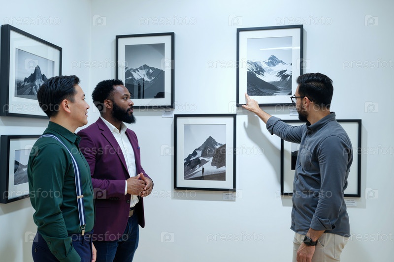 Мультиэтнические молодые взрослые мужчины обсуждают ландшафтную фотографию