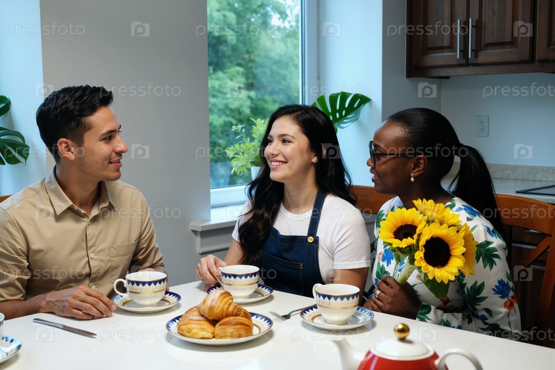 Молодые взрослые разных этнических групп наслаждаются завтраком и беседой в помещении