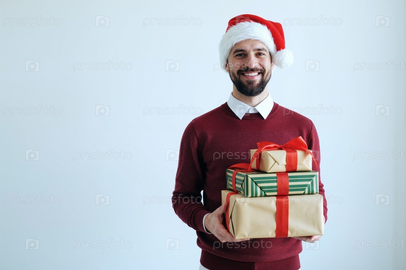 Портрет молодого взрослого человека, улыбающегося в то время как он держит рождественские подарки