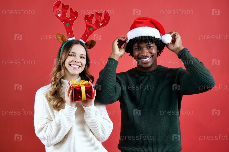 Молодая женщина и молодой чернокожий мужчина празднуют Рождество, улыбаясь вместе