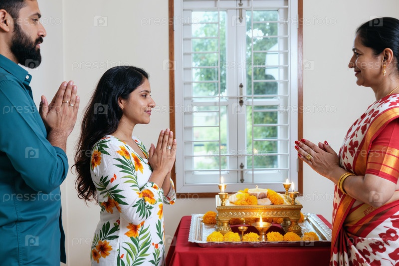 Молодой взрослый индийский мужчина и женщина выполняют традиционный ритуал молитвы в помещении