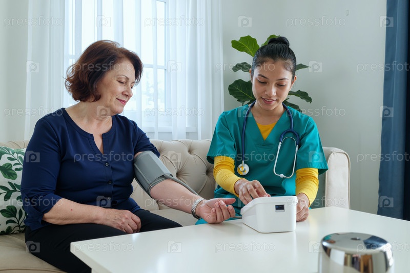 Женщина средних лет с артериальным давлением проверяется молодой азиатской медсестрой