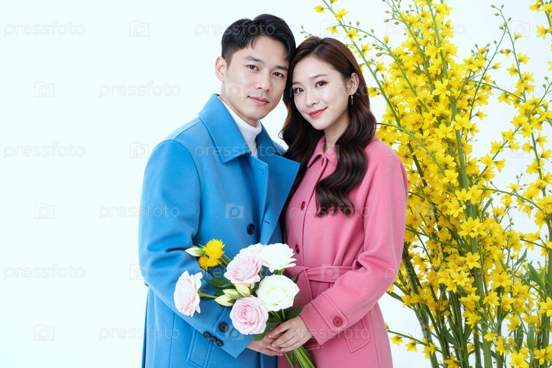 Портрет молодой взрослой азиатской пары, держащей цветы Стоя рядом с желтыми цветами