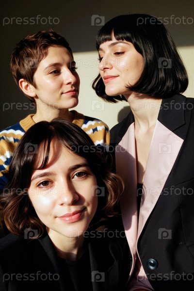 Портрет трех молодых взрослых женщин, улыбающихся на солнце в помещении
