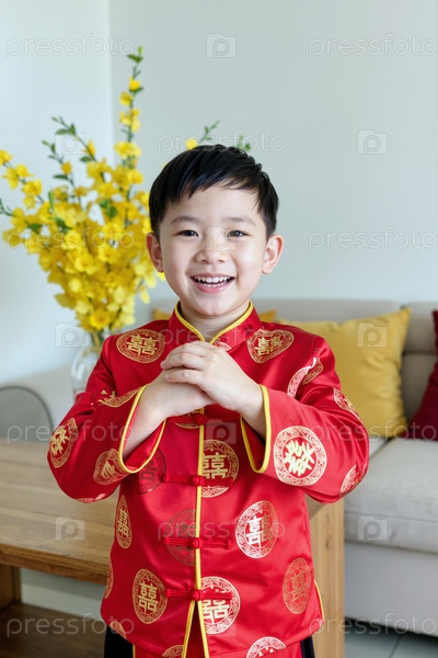Портрет азиатского мальчика, улыбающегося и приветствующего внутри во время праздничного торжества