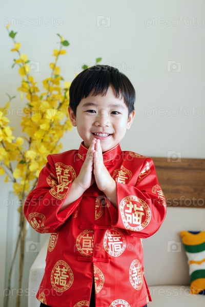 Азиатский мальчик улыбается, приветствуя друг друга руками во время празднования