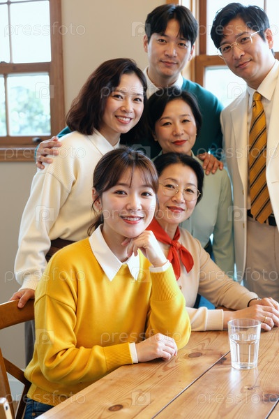 Группа азиатских людей среднего возраста и молодых взрослых, улыбающихся в помещении