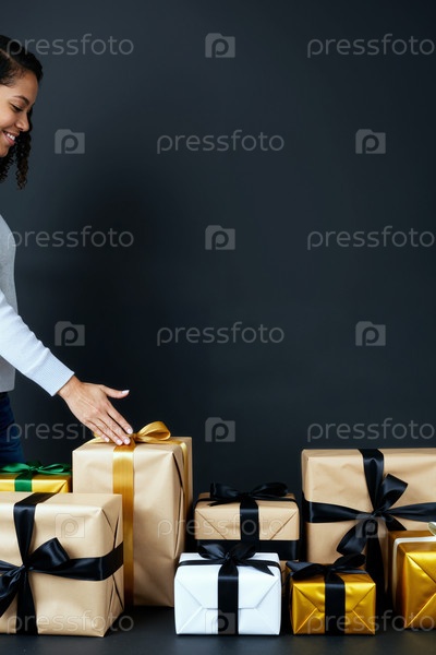 Молодая взрослая чернокожая женщина улыбается, устраивая упакованные коробки для подарков в помещении