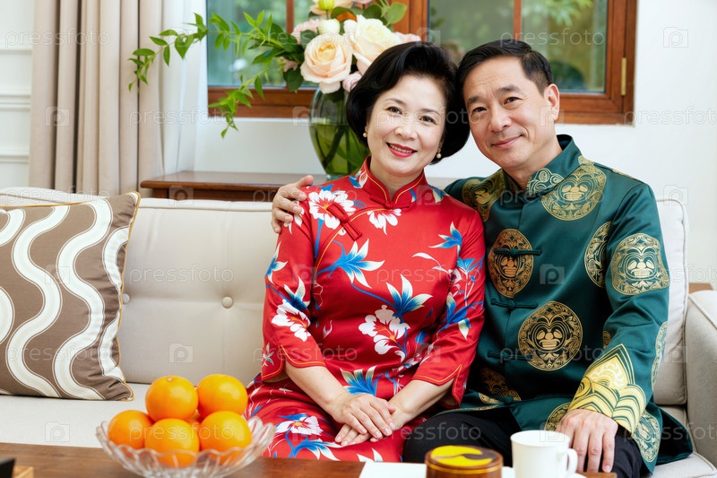 Азиатская пара средних лет, сидящая вместе и улыбающаяся в обстановке гостиной