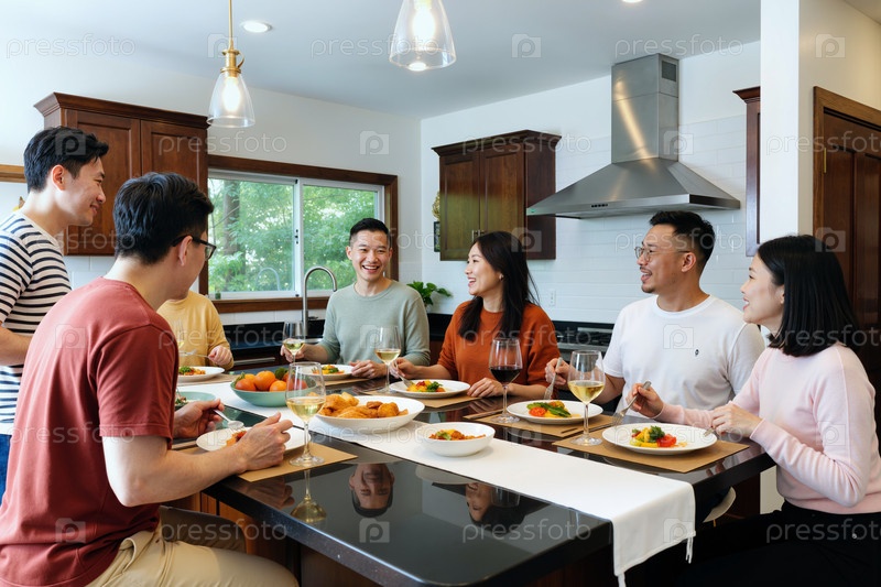 Группа молодых взрослых азиатских друзей, наслаждающихся едой вместе на современной кухне