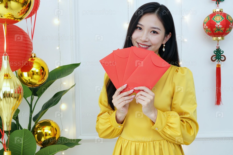 Портрет молодой взрослой азиатской женщины, улыбающейся, держа красные конверты