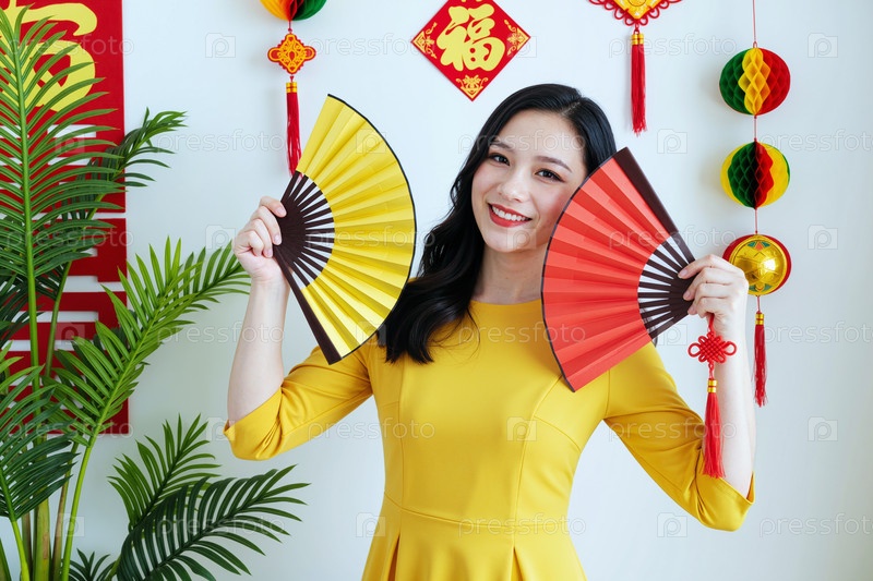 Портрет молодой взрослой азиатской женщины, улыбающейся, держа декоративные вентиляторы