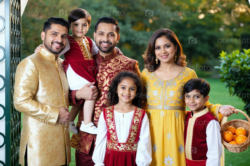 Мультиэтническая семья собирается на улице, улыбаясь и позируя перед камерой