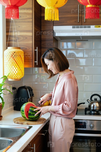 Молодая взрослая азиатская женщина нарезает арбуз в современной кухне днем