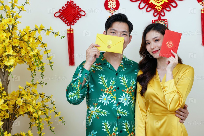 Молодая азиатская пара празднует лунный Новый год, держа красные и желтые конверты