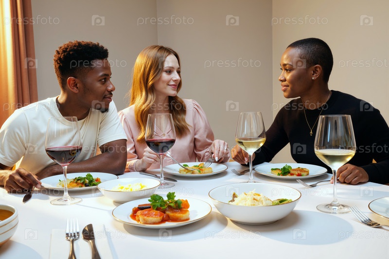 Мультиэтнические молодые взрослые наслаждаются ужином вместе за современным столом