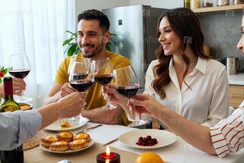 Молодой взрослый мужчина и женщина тостируют винные бокалы во время собрания