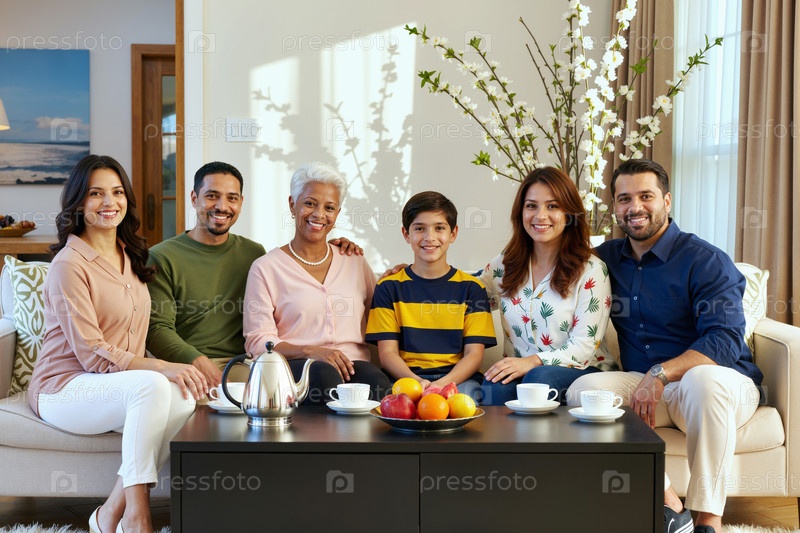 Мультиэтническая семья сидит вместе, улыбается в гостиной