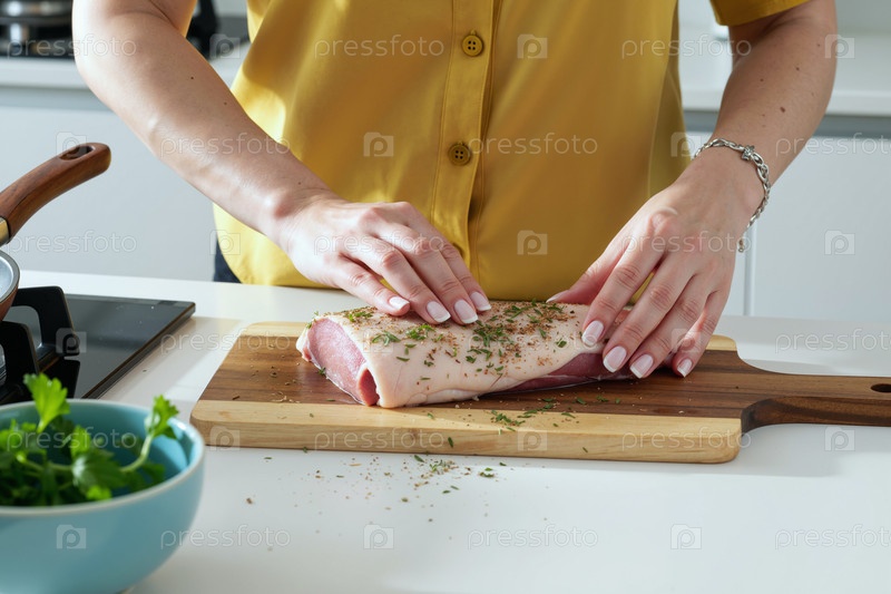 Молодая взрослая женщина приправляет сырую свинину на деревянной доске