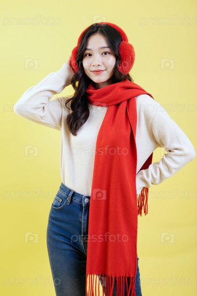 Портрет молодой взрослой азиатской женщины, улыбающейся при ношении шарфа и наушников