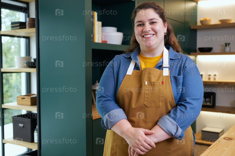 Портрет молодой женщины, улыбающейся уверенно на современной кухне