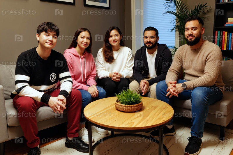 Мультиэтнические молодые взрослые сидят вместе и улыбаются в современной гостиной