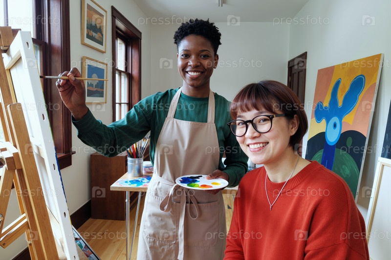 Молодая черная женщина рисует полотно рядом с улыбающейся молодой азиатской женщиной