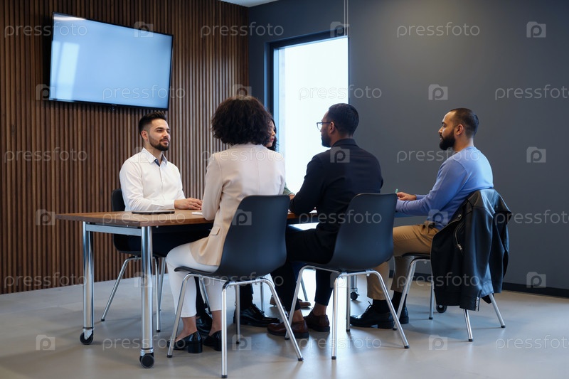 Мультиэтнические молодые взрослые сотрудничают во время деловой встречи в офисе