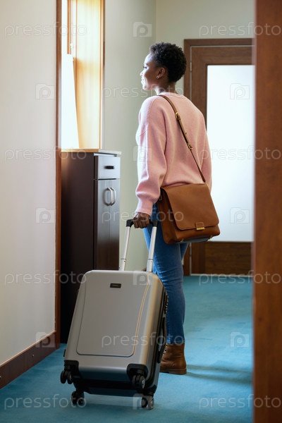 Молодая чернокожая женщина стоит в помещении, держит чемодан и смотрит наружу
