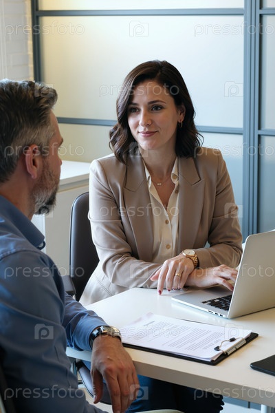 Молодая женщина обсуждает бизнес-стратегию с мужчиной средних лет