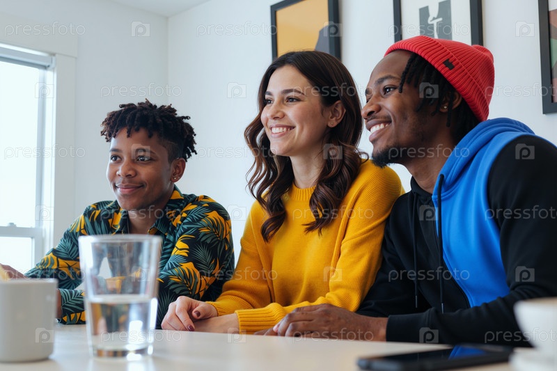 Мультиэтнические молодые взрослые улыбаются, сидя вместе во время встречи