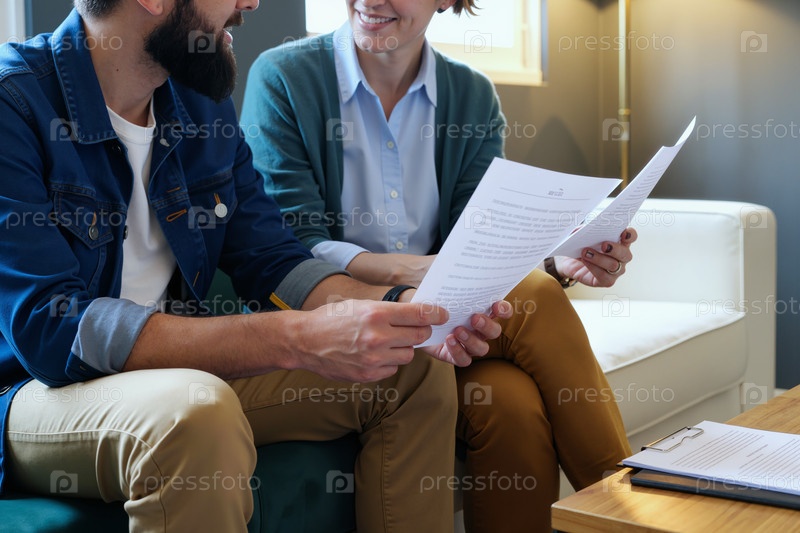 Молодой мужчина и женщина обсуждают документы во время деловой встречи
