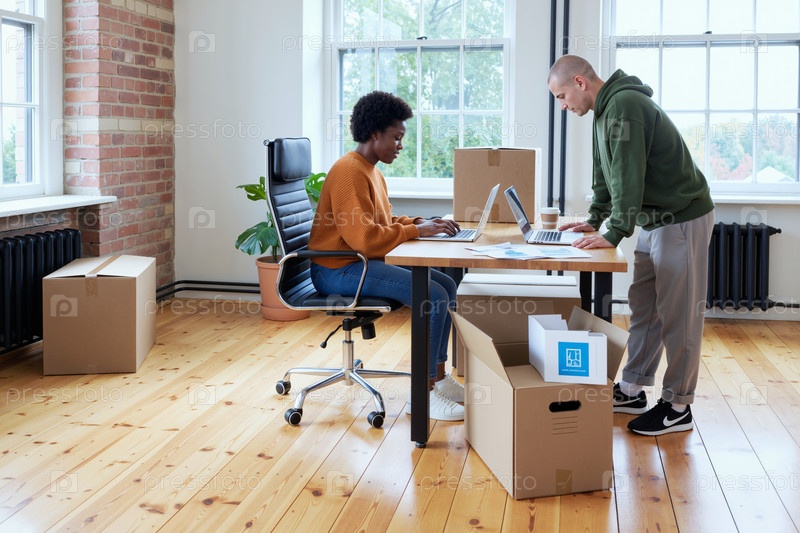 Молодой человек помогает молодой чернокожей женщине распаковать коробки в офисе