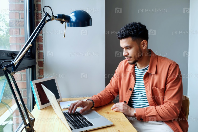 Молодой человек работает на ноутбуке в домашнем офисе Стол возле окна