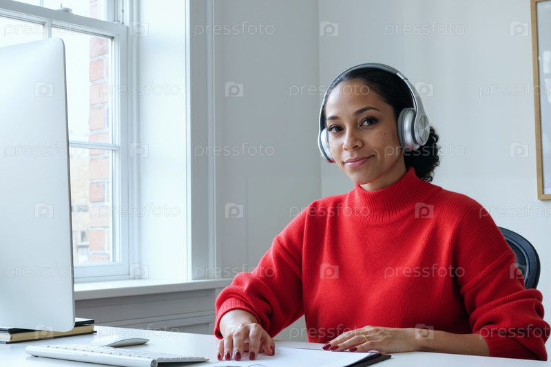 Портрет молодой женщины, носящей наушники и работающей удаленно