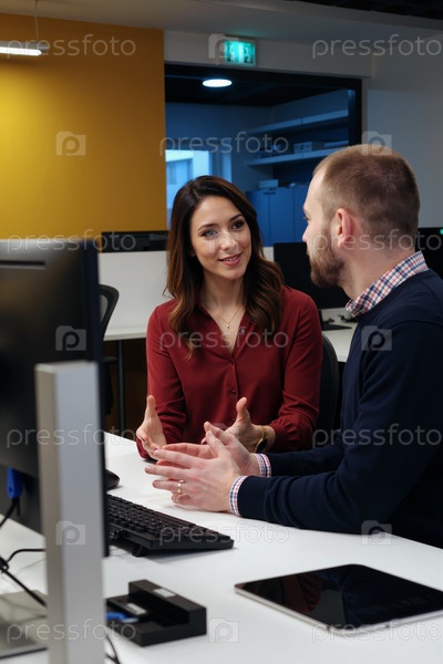 Молодая женщина объясняет молодому человеку проект