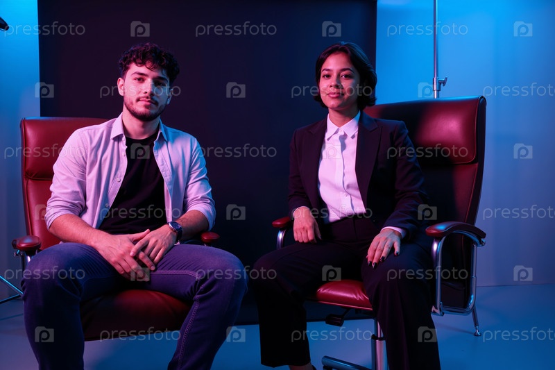 Портрет молодого человека и молодой азиатской женщины, сидящих в студии