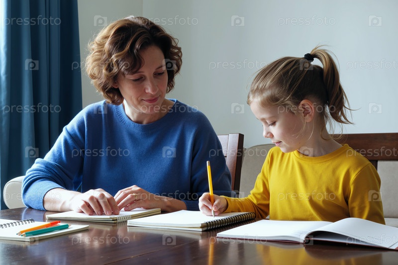 Женщина средних лет помогает ребенку Девочка учится за столом