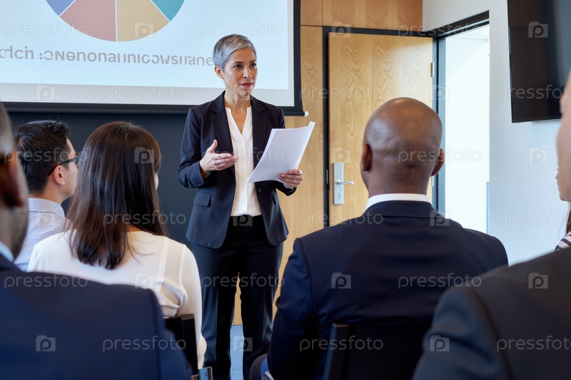 Деловая женщина среднего возраста представляет отчет для разнообразной аудитории