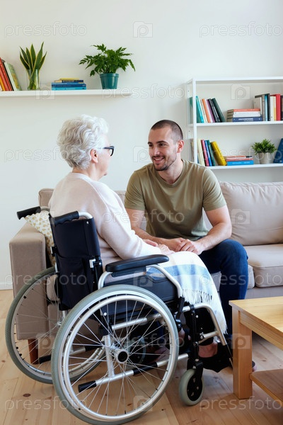 Мужчина средних лет поддерживает пожилую женщину с инвалидностью