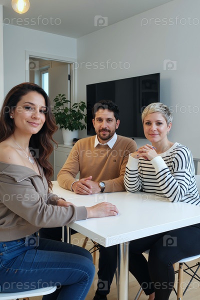 Три молодых взрослых, сидящих вместе за столом в современном офисе