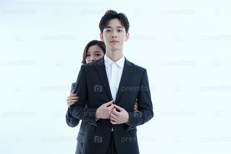 Молодой азиатский мужчина уверенно стоит рядом с молодой азиатской женщиной, которая обнимает его сзади