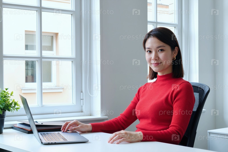 Портрет молодой азиатской женщины, работающей на ноутбуке в современном офисе