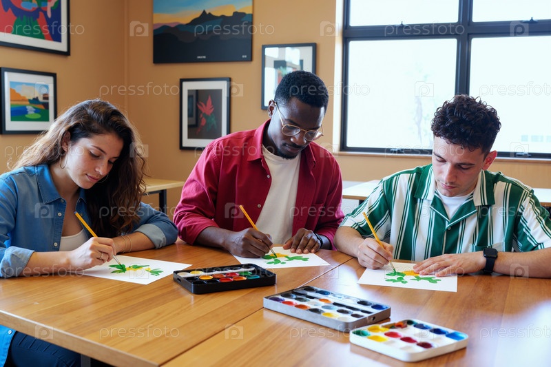 Мультиэтнические Молодые взрослые рисуют акварельные краски Искусственные работы вместе в помещении