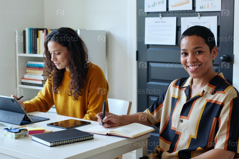 Портрет молодых мультиэтнических женщин, сотрудничающих и улыбающихся в помещении