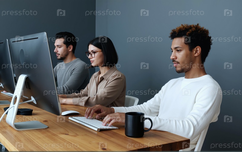Молодые мультиэтнические коллеги сотрудничают на компьютерах в современном офисе