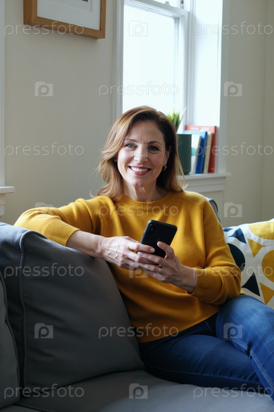 Портрет женщины среднего возраста, улыбающейся во время использования смартфона в помещении
