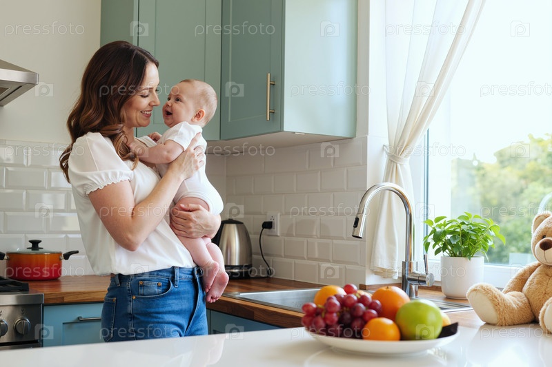 Молодая женщина держит улыбающегося ребенка в современной кухонной обстановке