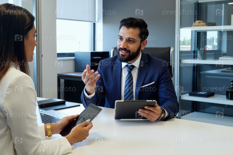 Мужчина средних лет обсуждает бизнес-стратегию с молодой женщиной