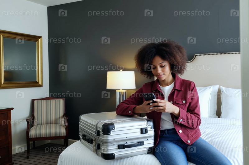 Молодая чернокожая женщина, сидящая на кровати с помощью смартфона в гостиничном номере